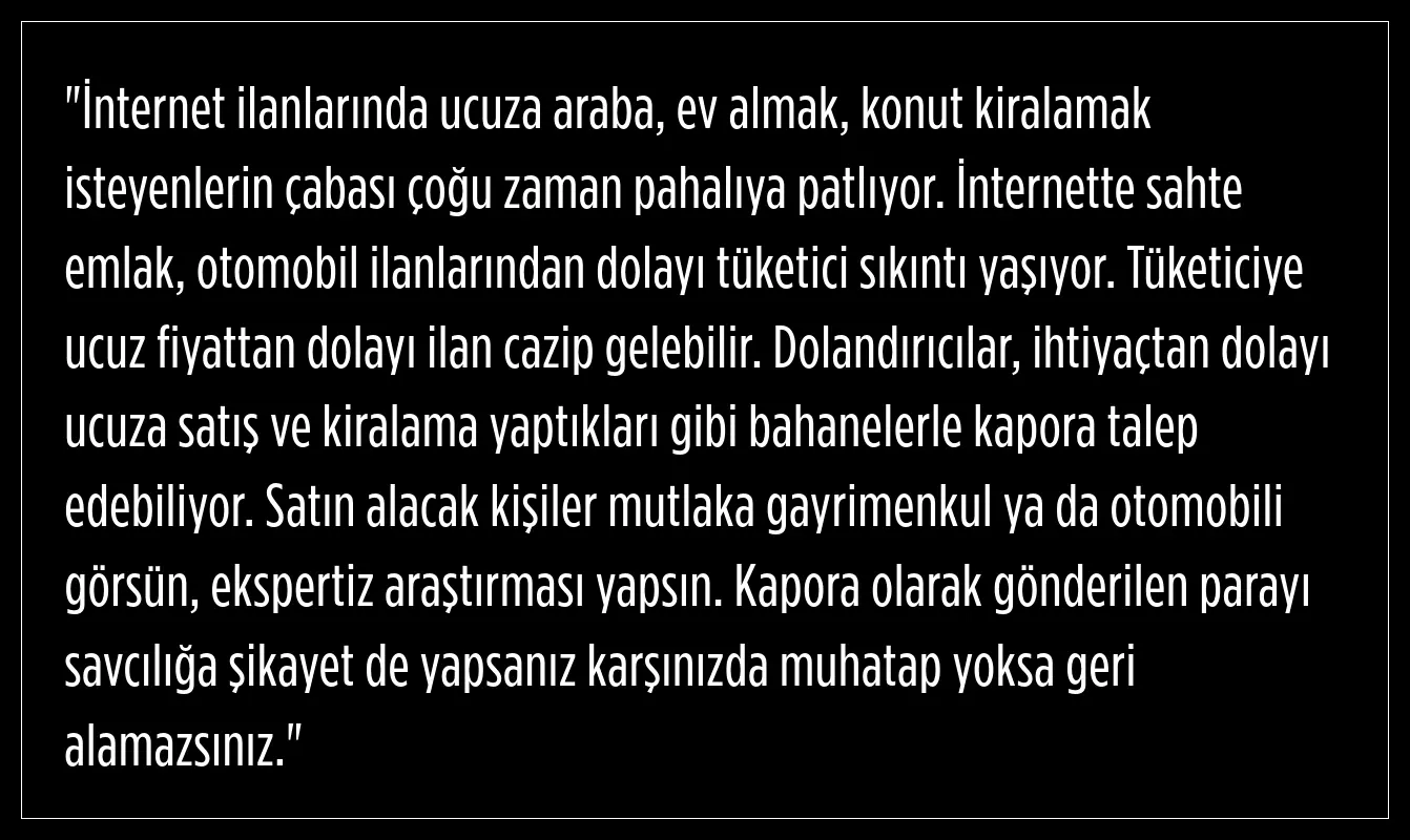 Tüketiciler Birliği Antalya Şube Başkanı Neşet Gündüz, internet üzerinden yapılacak kiralama işlemlerinde karşılaşılabilecek dolandırıcılık vakalarına karşı şu uyarıları yapıyor:
