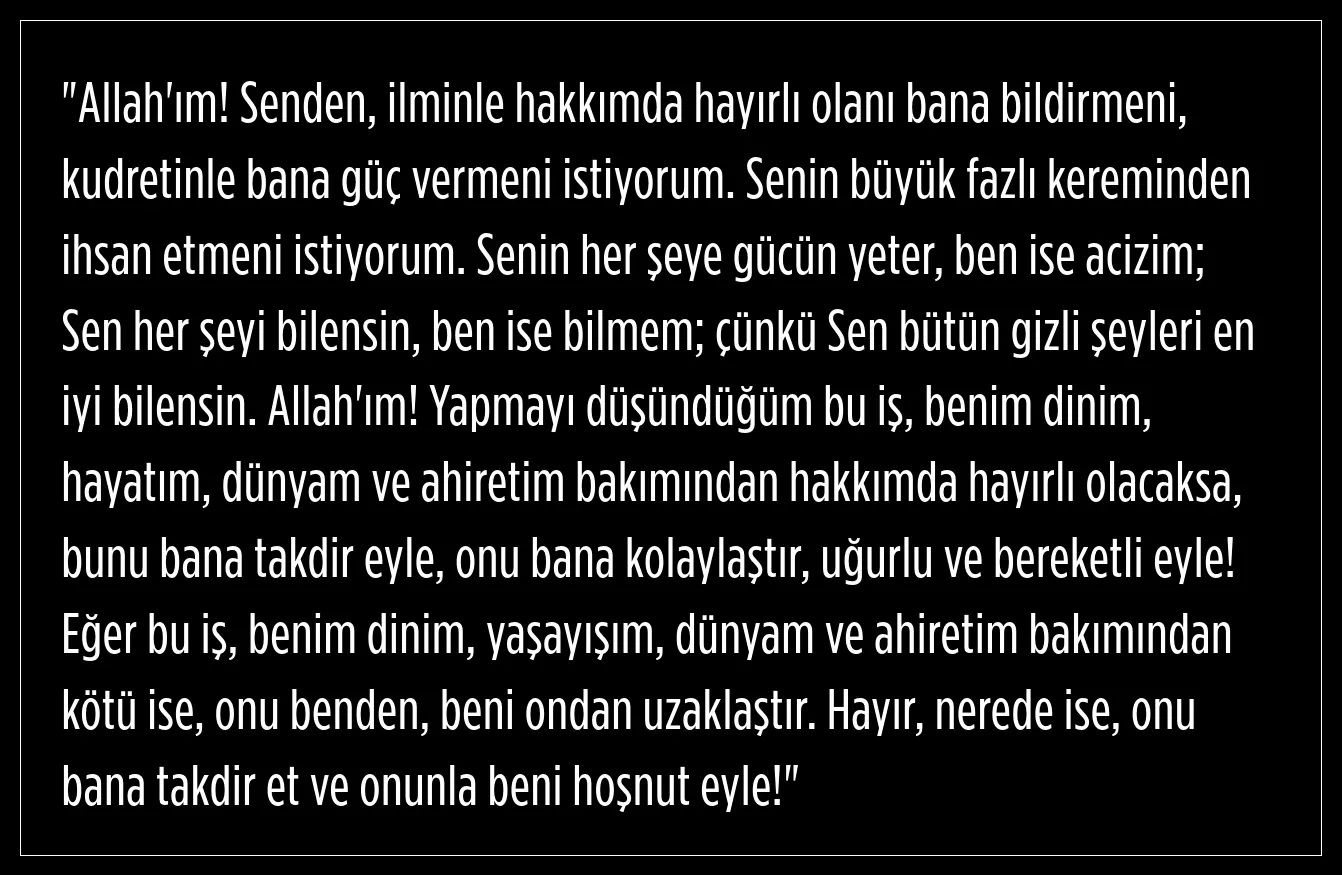 1 - Peygamberimizin sıkça başvurduğu istihare sünnettir. Yapılacak her iş için istihareye yatırılabilir.