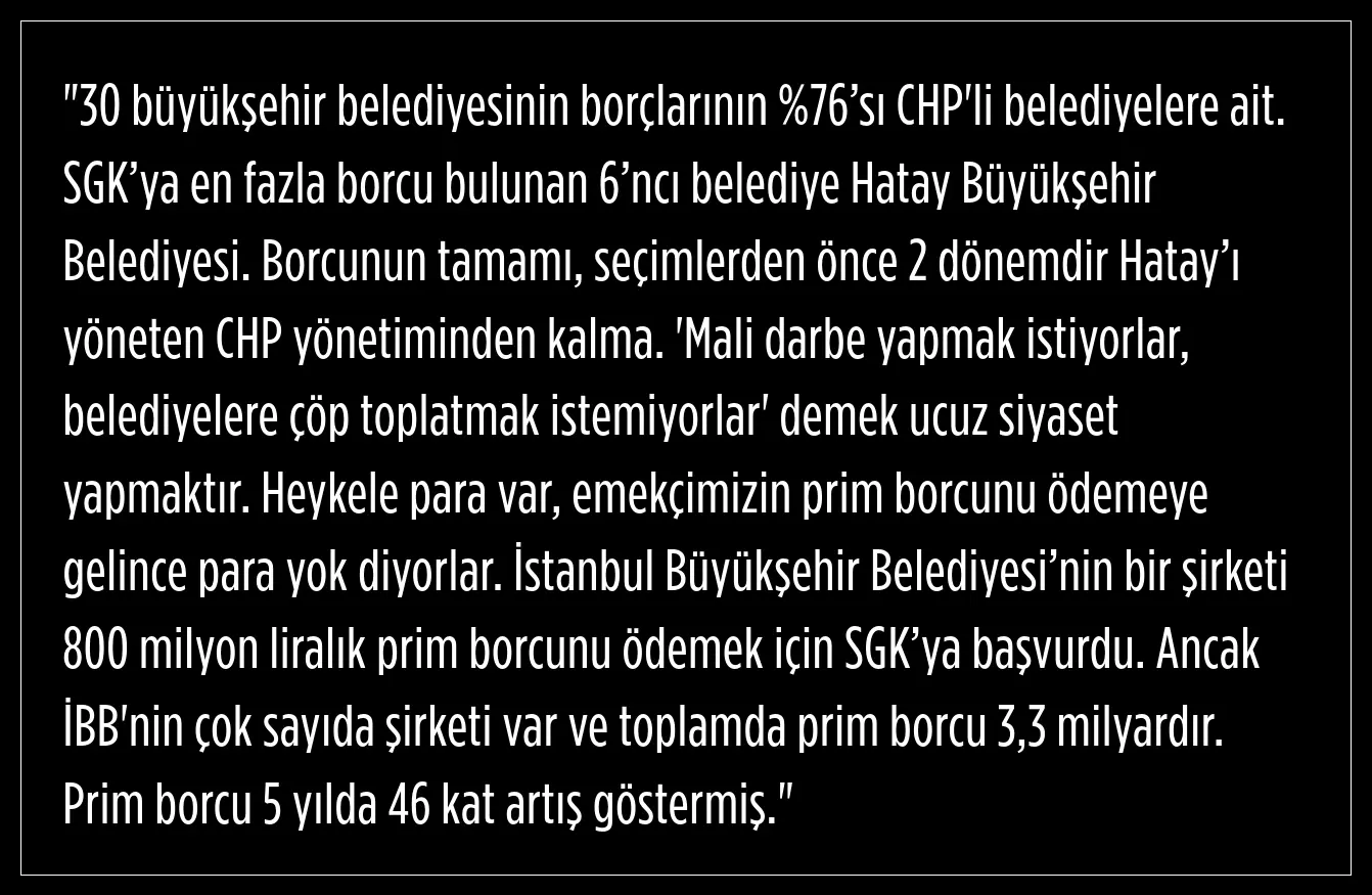 Belediyelerin Sosyal Güvenlik Kurumuna (SGK) olan borçlarının ödenmesi gerektiğini belirten Cumhurbaşkanı Erdoğan, siyasette yeni bir tartışmanın fitilini yakmıştı. CHP'li belediyelerin borcuna işaret eden Erdoğan, en fazla borcu olan belediyelerin CHP'de olduğunu vurgulamıştı.