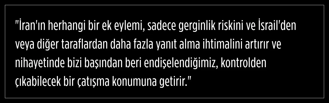 Daha geniş bir Orta Doğu çatışmasının "kaçınılmaz" olduğunu ifade eden Miller, ABD'nin "bunun olmasını önlemek için çalışmaya devam edeceğini" söyledi ve gerilimin artmasının bölgedeki hiçbir tarafın çıkarına hizmet etmeyeceğini vurguladı.