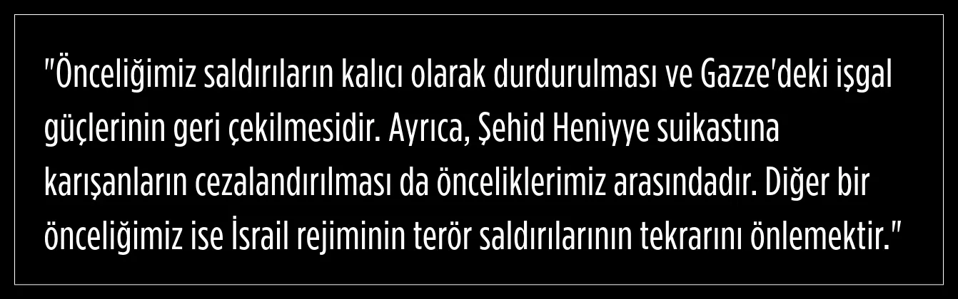 Hamas'tan yapılan yazılı açıklamada, Heniyye'nin yeni İran Cumhurbaşkanı Mesud Pezeşkiyan'ın görevi teslim törenine katılmak için Tahran'da bulunduğu belirtilmişti.