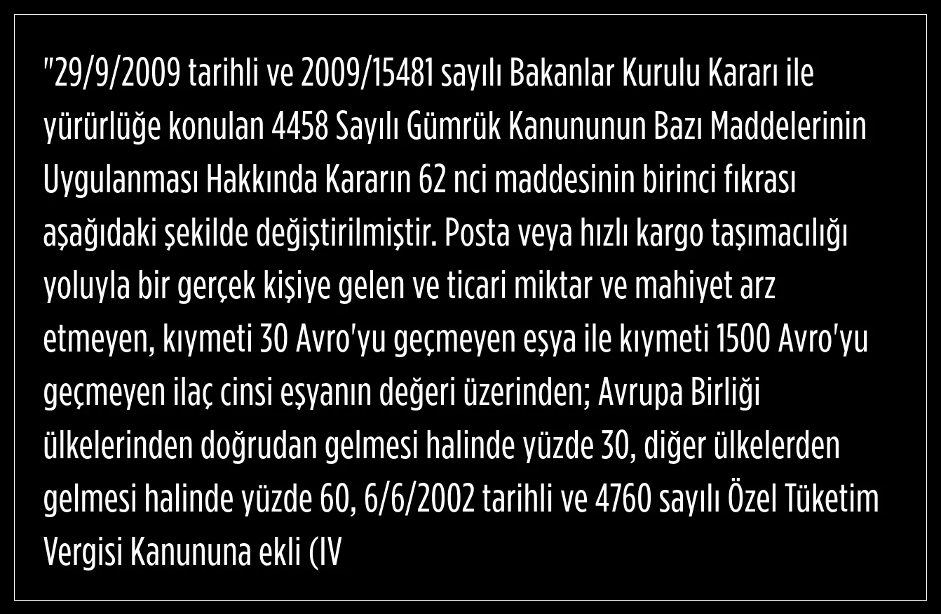 sayılı listede yer alan eşya olması durumunda yukarıdaki oranlara ilave yüzde 20, oranında tek ve maktu bir vergi tahsil edilir. Aynı Kararın 126 ncı maddesinin birinci fıkrasının (b) bendinde yer alan "150" ibaresi "30" şeklinde değiştirilmiştir.")