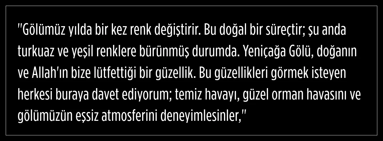 Gölün dip kısmında yeterli oksijenin bulunmaması ve buna bağlı olarak alg tabakasının su yüzeyine çıkması nedeniyle oluşan yeşil renk, Yeniçağa Gölü'ne farklı bir görünüm kazandırdı.