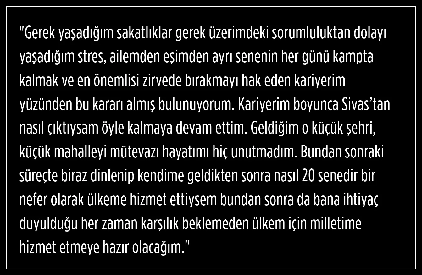 Kariyerine nokta koyan Taha Akgül, kısa bir dinlenme döneminin ardından ülkesine hizmet etmeye devam edeceğini söyledi. Yirmi yılı aşkın süredir Türkiye için bir nefer olarak çalıştığını belirten Akgül, ihtiyaç duyulduğunda milletine karşılık beklemeden hizmet etmeye her zaman hazır olacağını ifade etti.