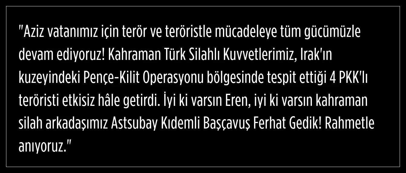 TSK'nın Pençe-Kilit Harekatı bölgesindeki yaptığı son operasyonda 4 terörist sarı torbaya konuldu. Milli Savunma Bakanlığı, operasyona dair paylaşım yaptı.