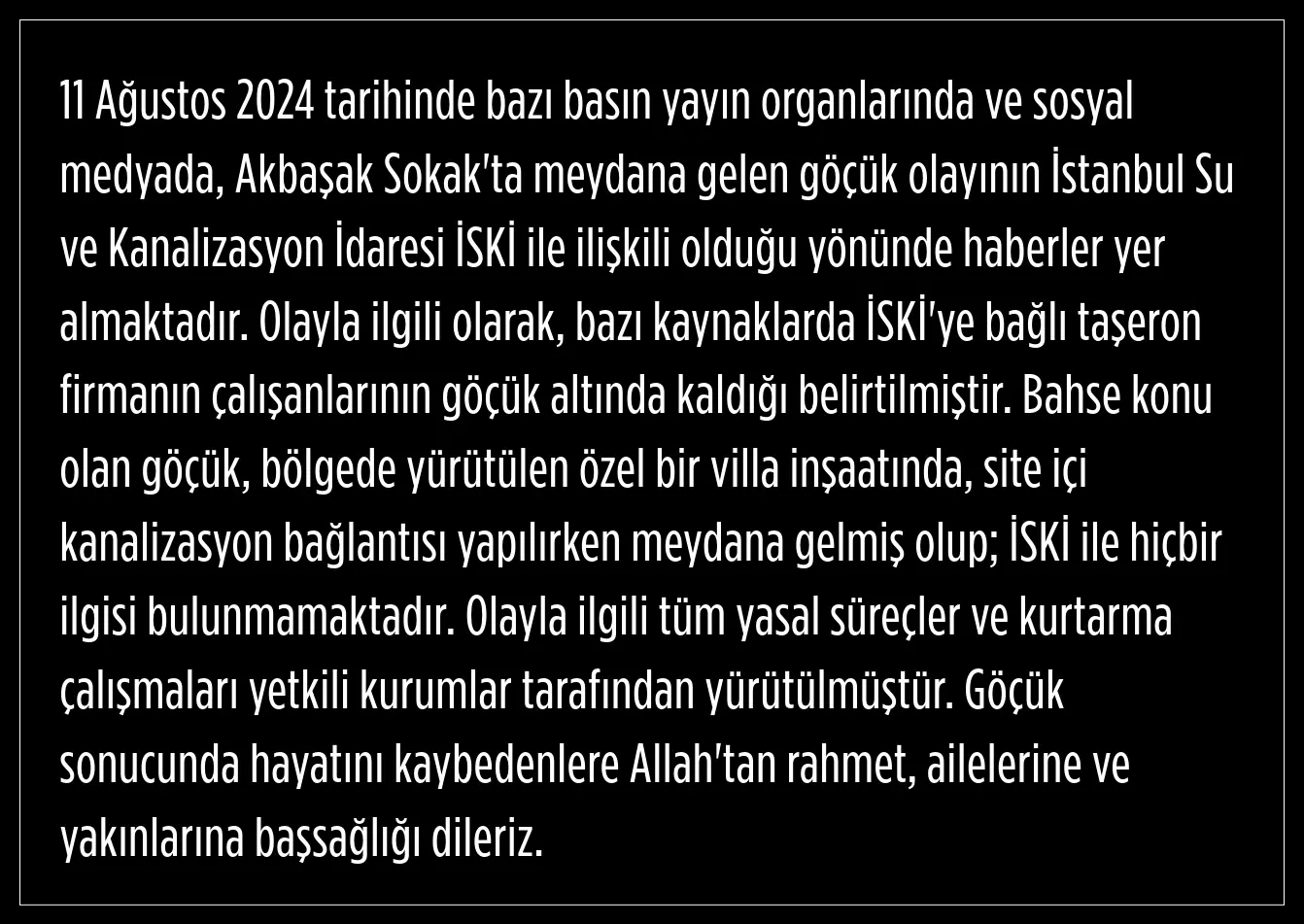 İstanbul Su ve Kanalizasyon İdaresinden (İSKİ) olayla ilgili şu açıklamada bulundu: