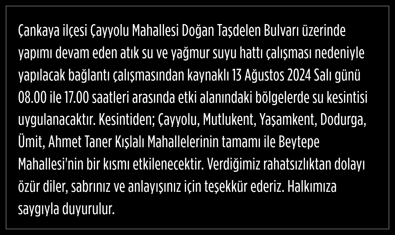 ASKİ, kesintiden Çayyolu, Mutlukent, Yaşamkent, Dodurga, Ümit, Ahmet Taner Kışlalı Mahallelerinin tamamı ile Beytepe Mahallesi'nin bir kısmının etkileneceğini ifade etti.
