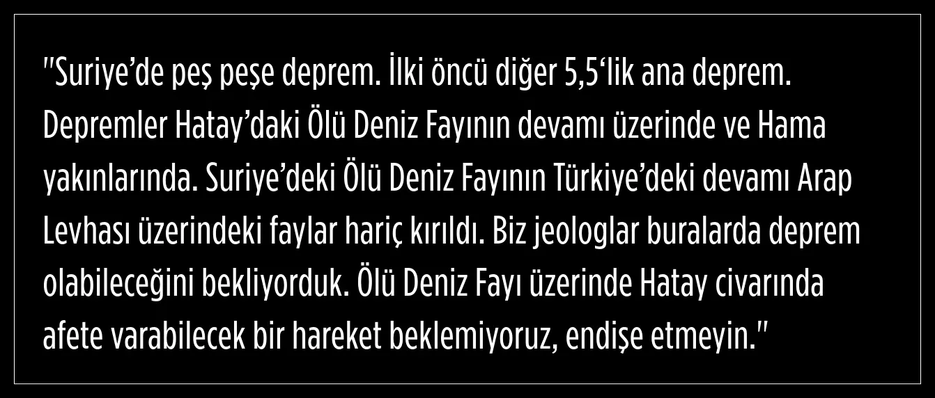 Suriye'de peş peşe sarsıntıların olduğunu ifade eden Görür, Hatay ve civarında afete varabilecek bir hareket beklenmediğini ifade etti.