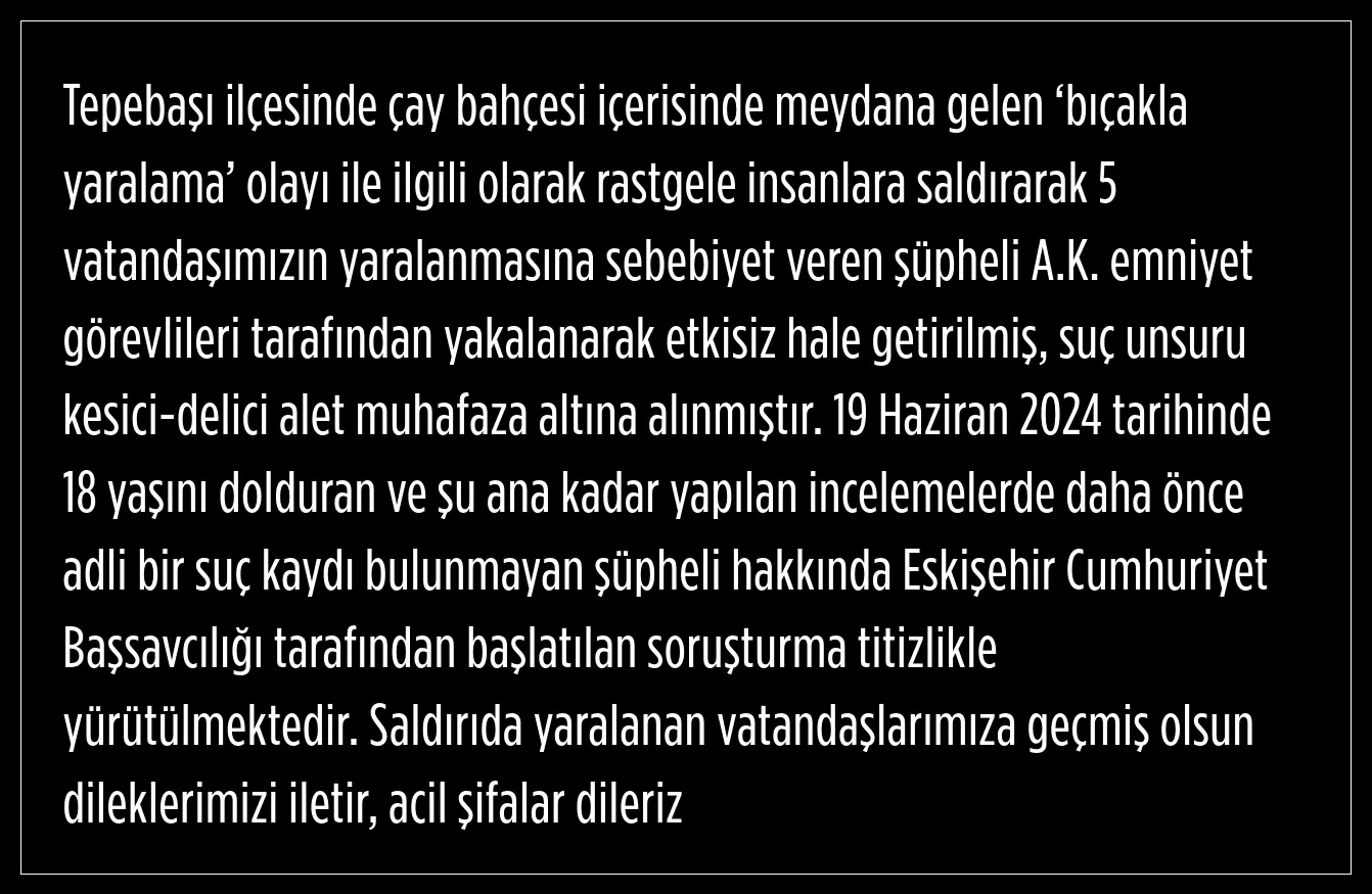 Valilik, A.K'nin yapılan incelemelerde adli bir suç kaydının bulunmadığı ve şüpheli hakkında Eskişehir Cumhuriyet Başsavcılığı tarafından başlatılan soruşturmanın titizlikle yürütüldüğünü ifade etti.