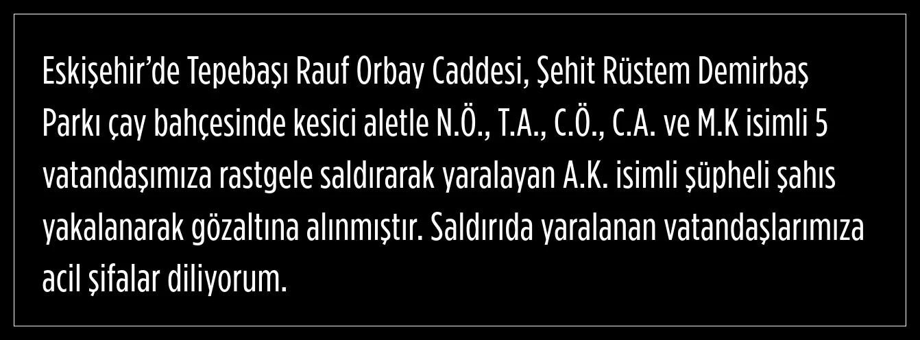İçişleri Bakanı Ali Yerlikaya, Eskişehir'de 5 kişinin yaralanmasına neden olan A.K'nin gözaltına alındığını açıkladı.