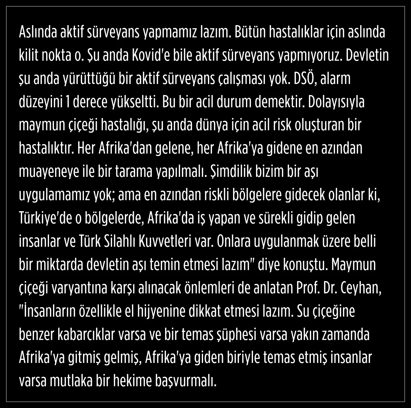 Türkiye'nin önemli bir destinasyon noktası olduğunu vurgulayan Prof. Dr. Ceyhan, "Türkiye özellikle İstanbul, Afrikalılar için gerek kalıcı olarak gerekse de transfer şeklinde çok kullanılan bir destinasyon. İstanbul'a geliyorlar, oradan Avrupa'ya, Amerika Birleşik Devletleri'ne (ABD) gidiyorlar ve çok sayıda da Afrika vatandaşı, İstanbul başta olmak üzere Türkiye'de kalıyor. Nitekim hastalık da sadece Demokratik Kongo Cumhuriyeti ile sınırlı kalmadı. Kongo'ya komşu ülkelerin hepsine yayıldı. Gine'de, Nijerya'da vakalar rapor edilmeye başlandı. Şu anda bir yayılma söz konusu ve bunun için DSÖ alarmda. Özellikle Afrika'dan gelenler ve Afrika'ya gidecek olanlar için tedbirler yayımlıyor. Dünya için eğer bir vaka artışı söz konusuysa bir hastalıkta, bu salgındır. Eğer birden fazla kıtayı tutuyorsa, bir pandemidir. Bu solunum yoluyla bulaşan bir hastalık olmadığı için o kadar hızlı yayılım olmaz. Solunum yoluyla bulaşan pandemiler gibi, grip pandemisi, koronavirüs pandemisi gibi bir anda 100 binlerce, milyonlarca vakaya ulaşmaz. Ama yavaş yavaş artarak dünya için tehlike oluşturabilir" diye konuştu.