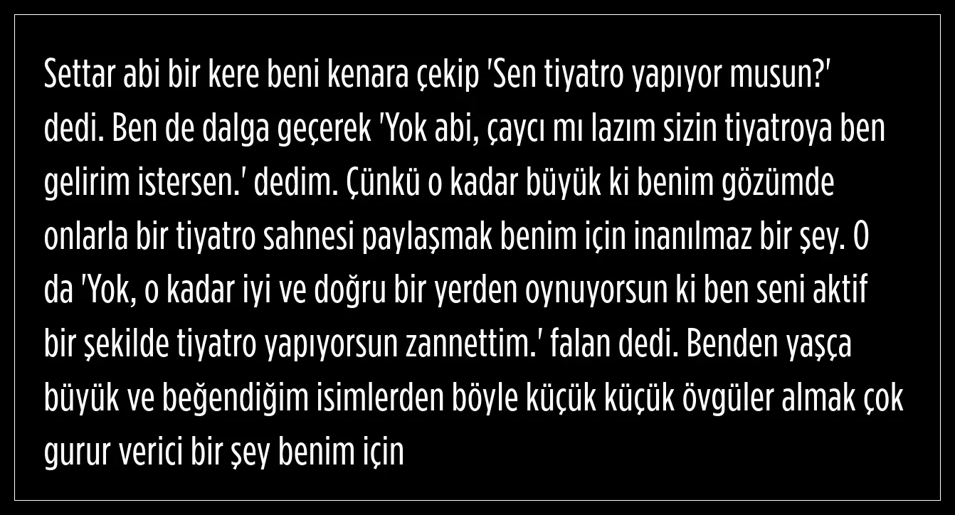 Kendisinin gözünde onlarla tiyatro sahnesi paylaşmanın inanılmaz bir şey olduğunu belirten Türkoğlu, kendisinden büyük ve beğendi isimlerden övgüler almanın çok gurur verici olduğunu söyledi.