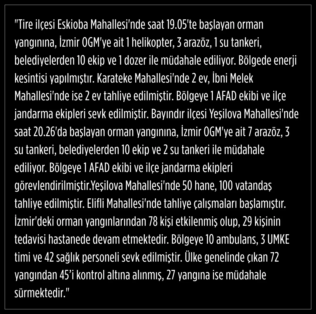 İzmir'deki yangınlarla ilgili bilgi veren açıklamada, Karşıyaka ilçesi Yamanlar Mahallesi'ndeki yangına 5 uçak, 11 helikopter, 127 arazöz, 13 TOMA, 68 su tankeri ve diğer araçlarla toplamda 596 araç ve 2 bin 965 personelin müdahale ettiği, ayrıca Sancaklı Mahallesi'nde 170, Doğançay Mahallesi'nde 500, Zübeyde Mahallesi'nde 50 ve Onur Mahallesi'nde 80 kişinin tahliye edildiği belirtildi.