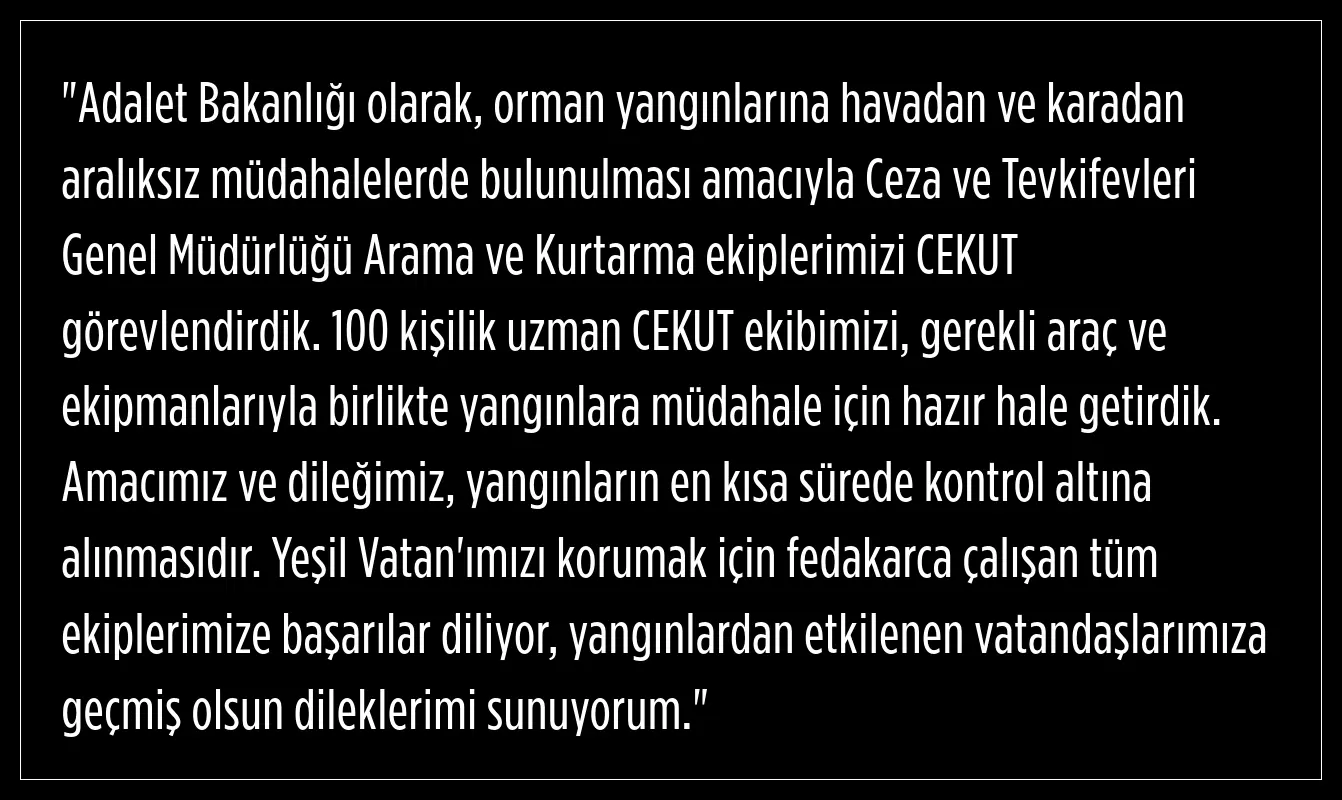 Tunç, sosyal medya hesabından yaptığı açıklamada, "Ülkemizin çeşitli bölgelerinde çıkan orman yangınlarıyla ilgili Cumhuriyet Başsavcılıkları tarafından adli soruşturmalar vakit kaybetmeden başlatılmıştır." ifadesine yer verdi.
