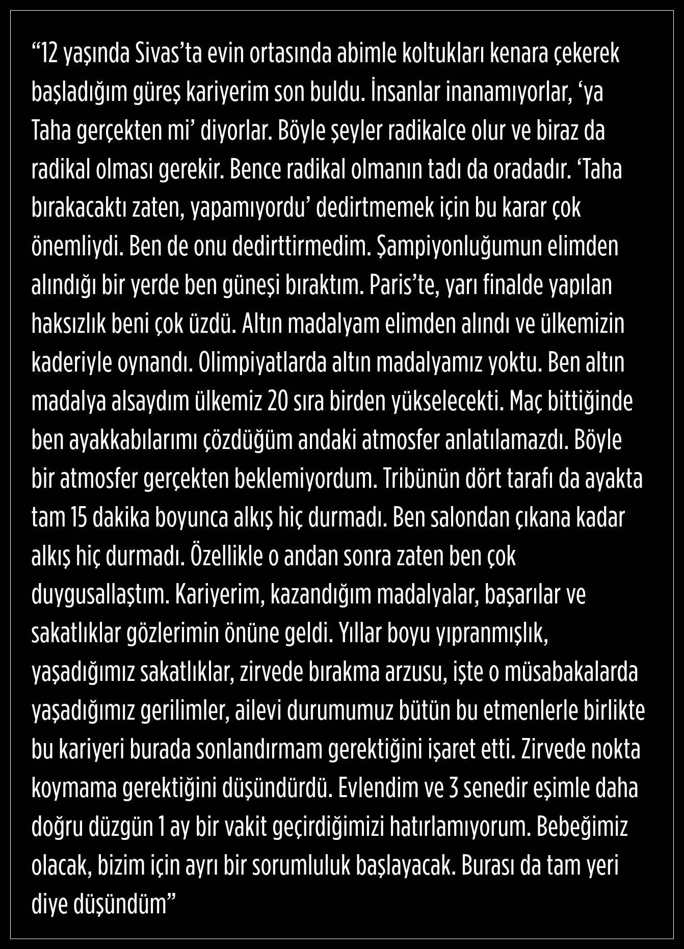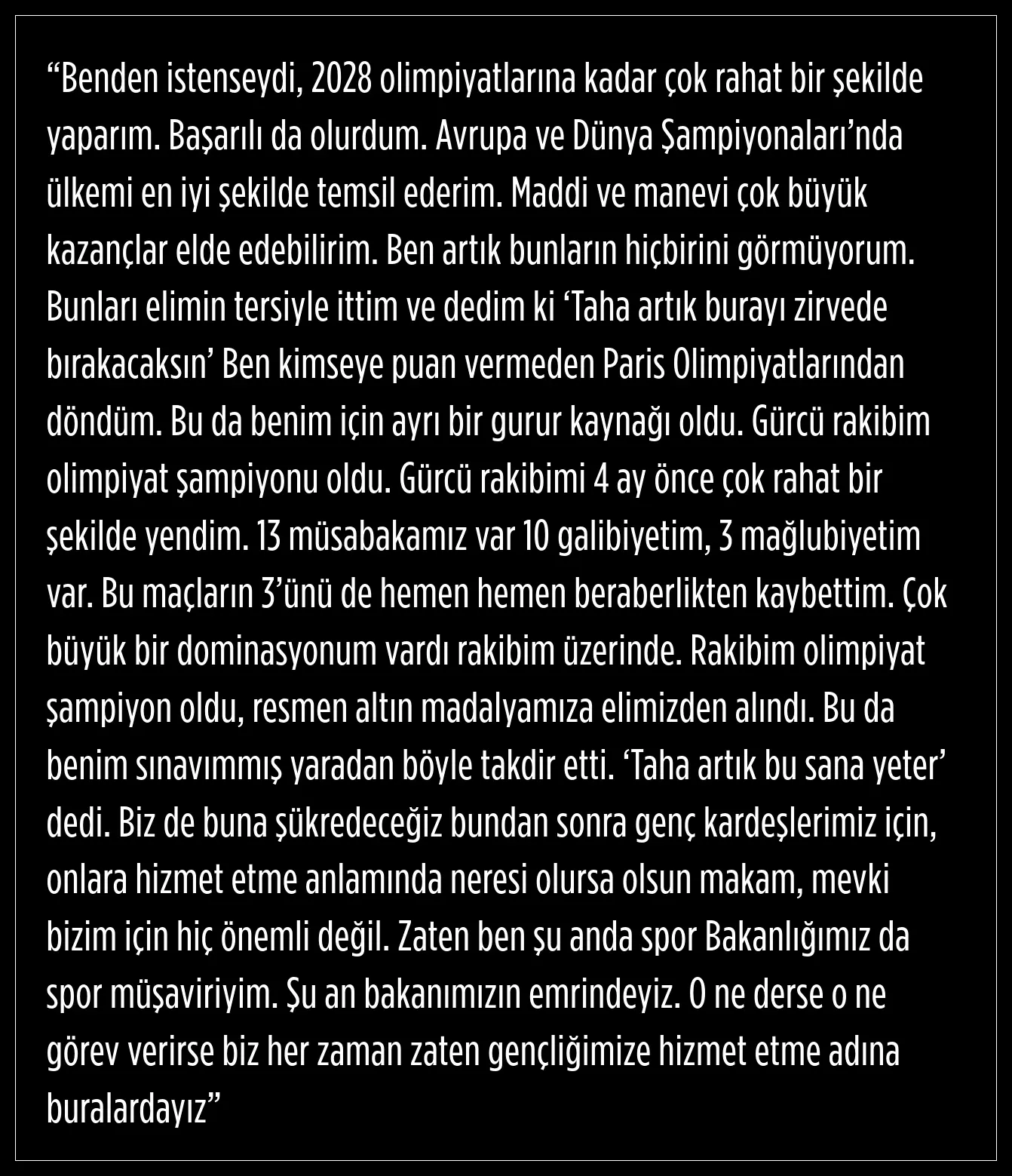 Taha Akgül, 21 yıllık güreş kariyerine birçok başarı sığdırarak, Paris Olimpiyatları'nda aldığı gümüş madalya ile kariyerini zirvede bırakma kararı aldı. Bu karar, Türk güreş tarihine altın harflerle yazılacak bir veda olarak hafızalarda kalacak. Akgül, kazandığı başarılar ve Türk sporuna kattığı değerle her zaman hatırlanacak bir isim olacak.