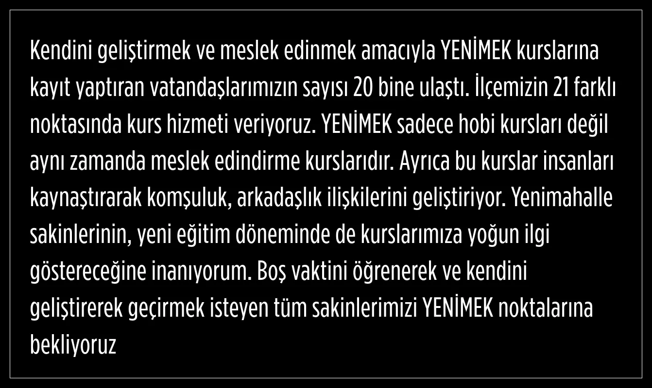 15 alan, 51 branşta eğitimlerin verildiği, Yenimahallerin yoğun ilgi gösterdiği YENİMEK kursları için kayıtlar başladı.