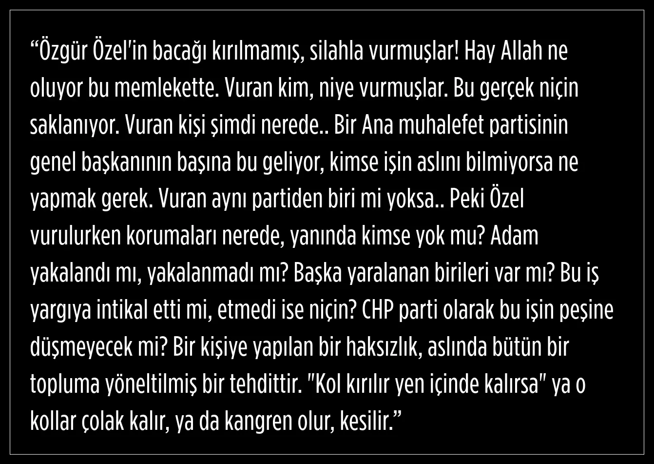 Dilipak sosyal medya hesabından yaptığı paylaşımda Özel'in ayağının kırılmadığını silahla vurulduğunu ileri sürdü. Dilipak paylaşımında şunları kaydetti:
