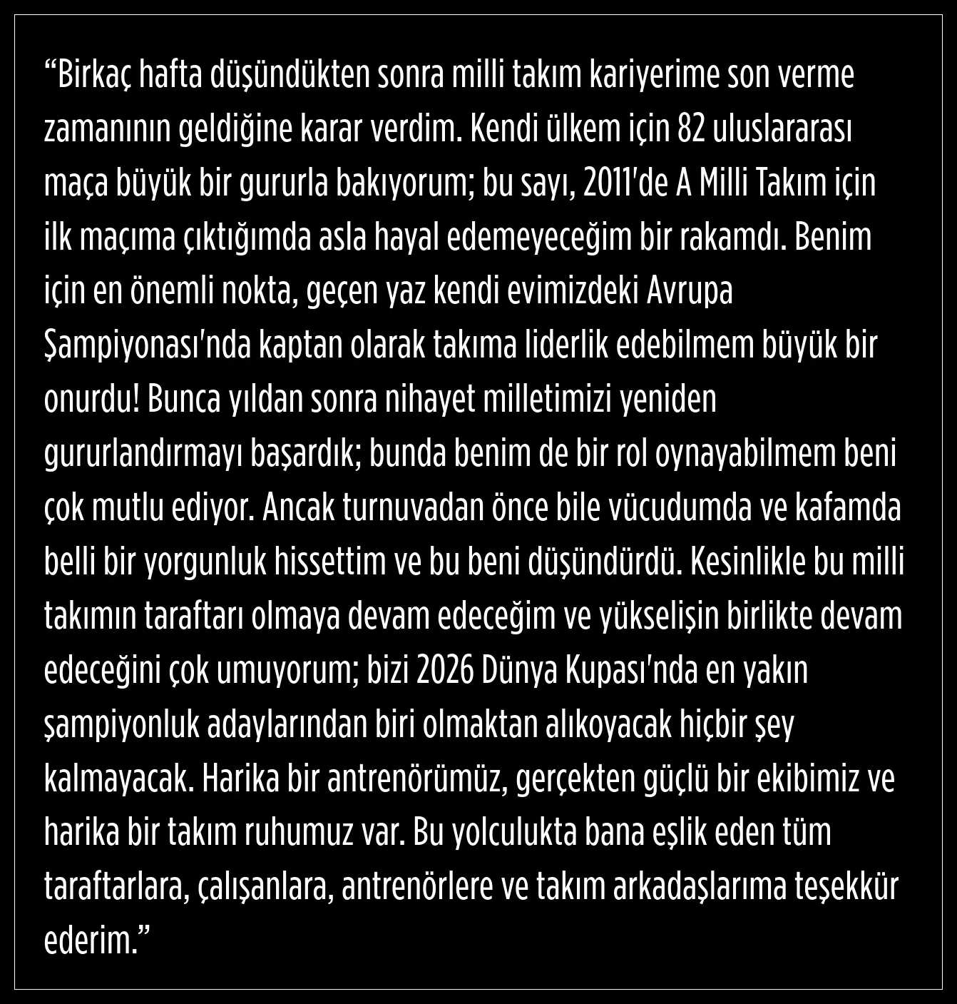 33 yaşındaki futbolcu duygularını dile getirdiği paylaşımında, birkaç hafta düşündükten sonra milli takım kariyerine son verme zamanının geldiğine karar verdiğini söyledi.