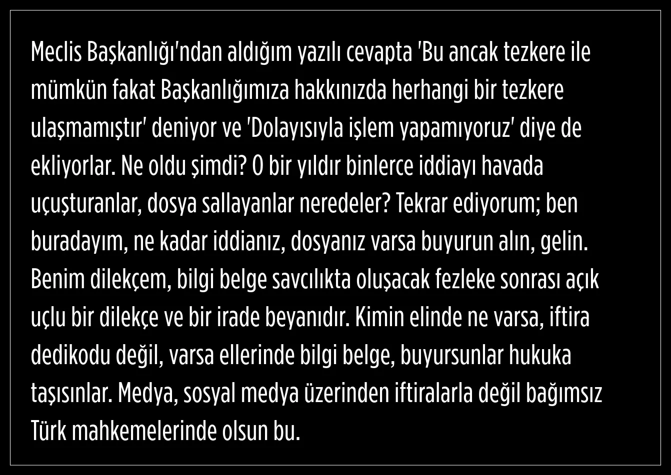 "Kimin elinde ne varsa, iftira dedikodu değil, varsa ellerinde bilgi belge, buyursunlar hukuka taşısınlar"