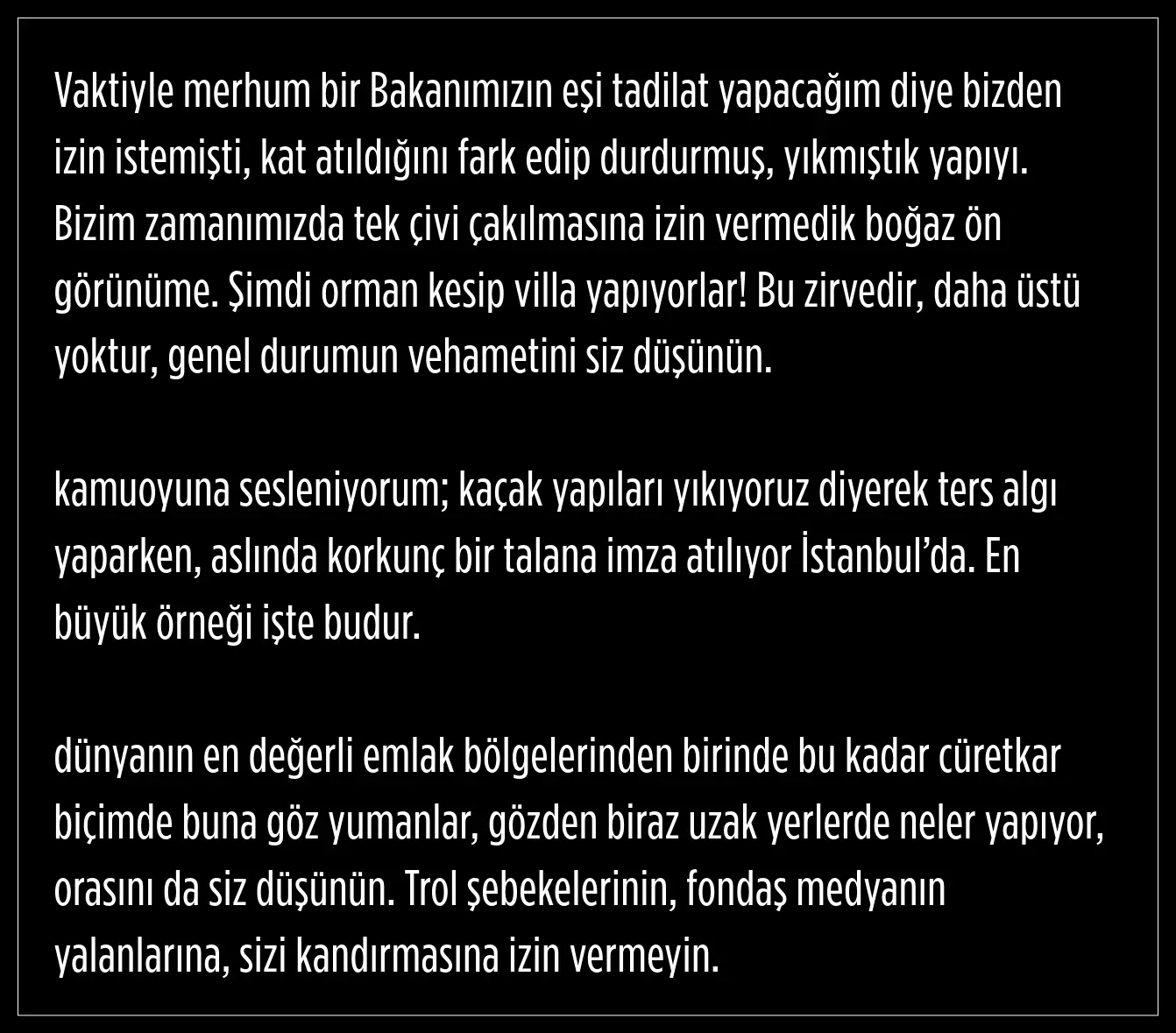 Ağaçların kesilerek villa yapılması sosyal medyada paylaşılınca tepki çekti. Ormanlık arazi içindeki villa inşaatı Çevre, Şehircilik ve İklim Değişikliği Bakanlığı'nı harekete geçirdi.