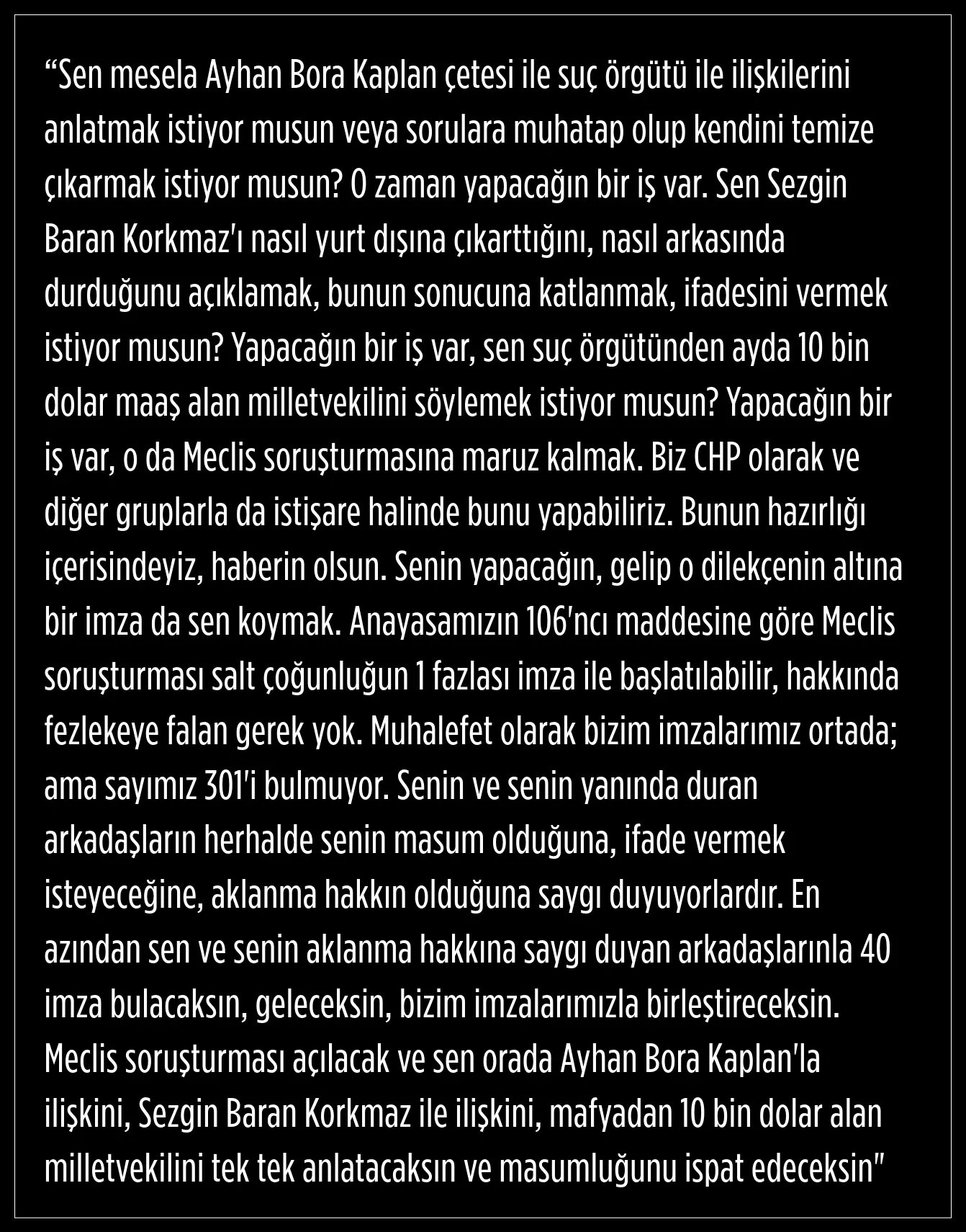 Emir, Ayhan Bora Kaplan, Sezgin Baran Korkmaz dosyalarıyla ayda 10 bin dolar maaş alan milletvekilini açıklamak istiyorsa Soylu’nun yapması gereken tek bir hareket olduğunu söyledi.