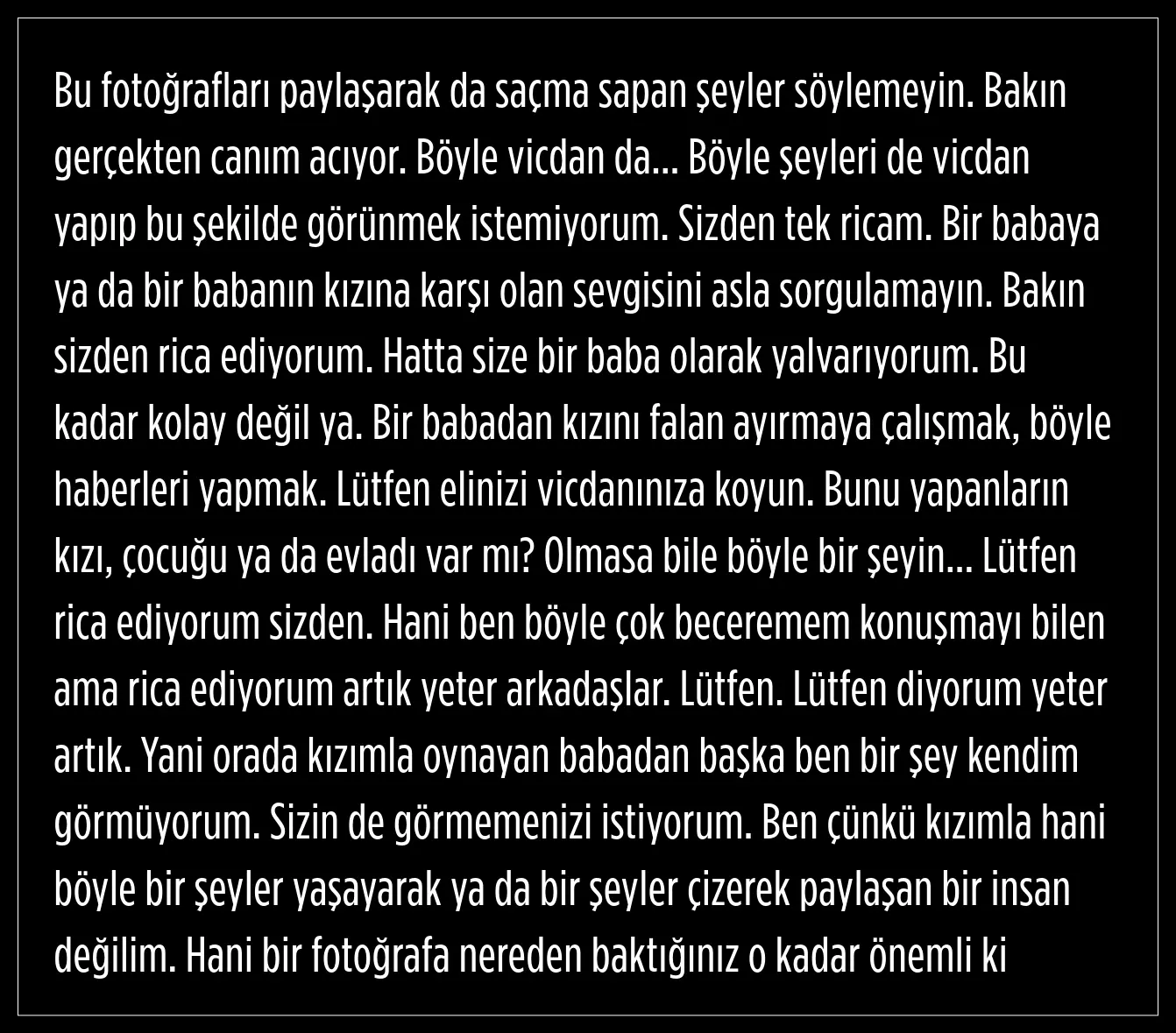 Kızıyla olan fotoğrafı nedeniyle ifadeye çağrılan Gökhan Çıra isyan etti. Çıra, ''Babanın kızına karşı olan sevgisini asla sorgulamayın. Yalvarıyorum'' dedi.