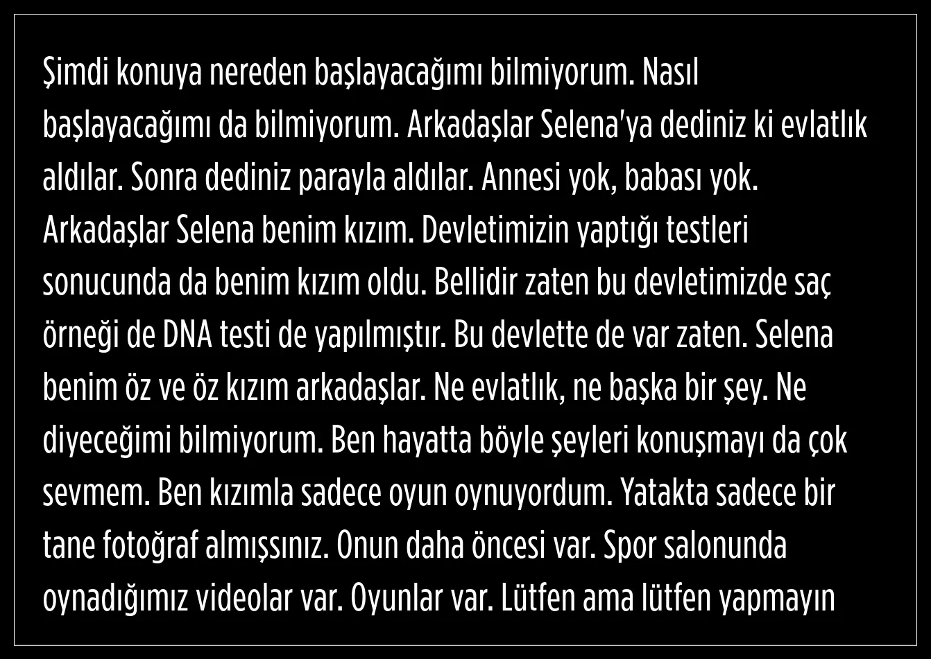 Gökhan Çıra, Selena'nın kendisinin öz be öz kızı olduğunu ifade ederek, devletin yaptığı test sonuçlarında belli olduğunu söyledi.