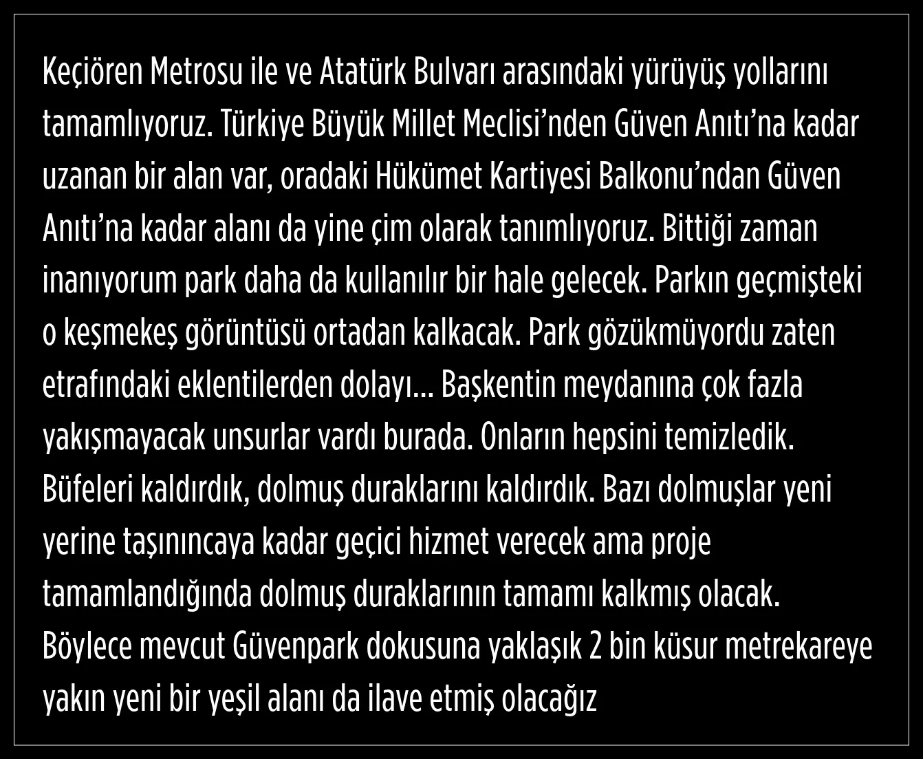 Şehir merkezinde yer alan, Ankara'nın en bilinen ve gözde parklarından birisi olan Güvenpark'ta tarihi dokuya sadık kalınıyor ve yeşil alanlar korunuyor.