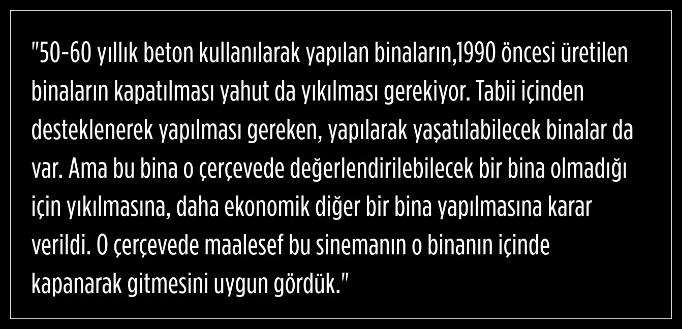 "Sokak sineması" olarak nitelendirdiği sinemaların artık pek görülemediğini ve şu an sinemaların alışveriş merkezlerinde yer aldığını dile getiren Köksal, "Bu sinemaların ekonomik ömürleri çok daha önce bitti. Bizim de bunu bitirmemiz, kapatmamız gerekiyordu." dedi.Sinema salonunun bulunduğu binanın yıkılacağını aktaran Köksal, şunları kaydetti:
