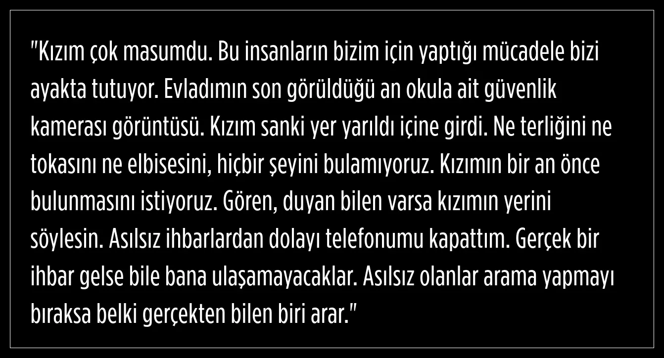 Kızının bulunması için Türkiye'nin dört bir yanından gelen destek nedeniyle teşekkür eden baba Arif Güran ise şu ifadeleri kullandı: