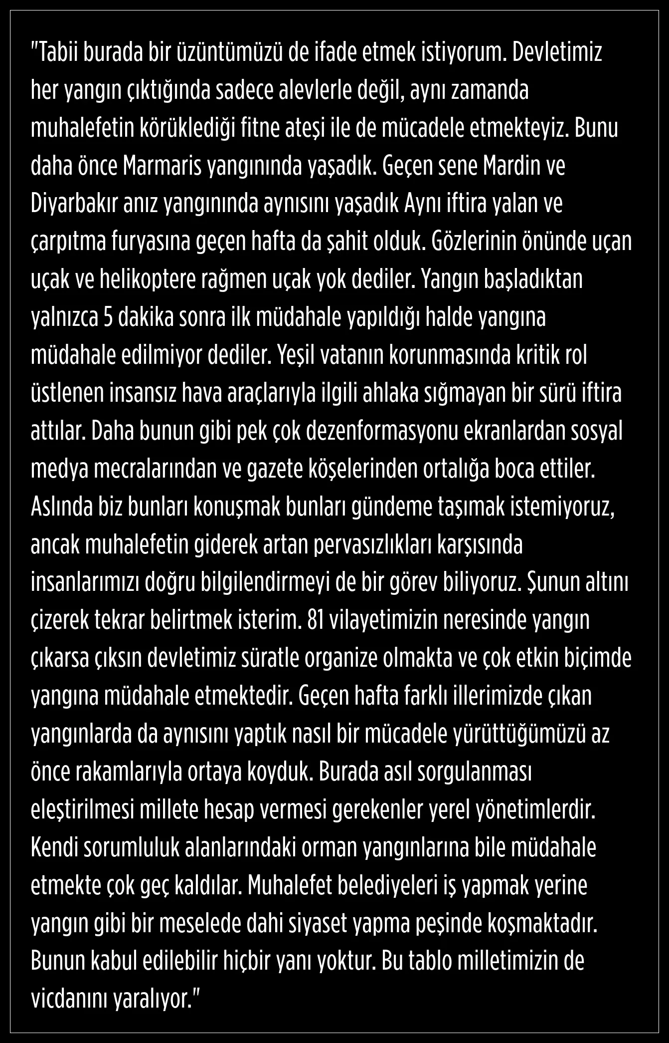 Ormanların 85 milyonun ortak değeri olduğunu ifade eden Cumhurbaşkanı Erdoğan, "Yangının depremin doğal afetin şu partisi veya bu partisi olmaz. Ormanlar hepimizindir. 85 milyonun ortak değeridir. Hayat kaynağıdır. Muhalefetin her konuyu siyasallaştıran bu çarpık bakış açısını bir an önce terk etmesini bekliyoruz. Yangınların kontrol altına alınmasından sonra bölgedeki vatandaşlarımızla telefon görüşmesi yaptım. Orada da yangınzede kardeşlerimize de özellikle ifade ettim. Daha önceki afetlerde olduğu gibi devletimiz vatandaşının yanındadır. Yangından etkilenen İzmir, Bolu, Çanakkale, Manisa, Uşak, Aydın ve Muğla'daki vatandaşlarımıza geçmiş olsun dileklerimi iletiyorum. Tam bir koordinasyon içinde çalışan orman genel müdürlüğümüz başta olmak üzere ilgili bakanlıklara kamu kurumlarımıza ve gönüllülerimize de teşekkür ediyorum." şeklinde konuştu.