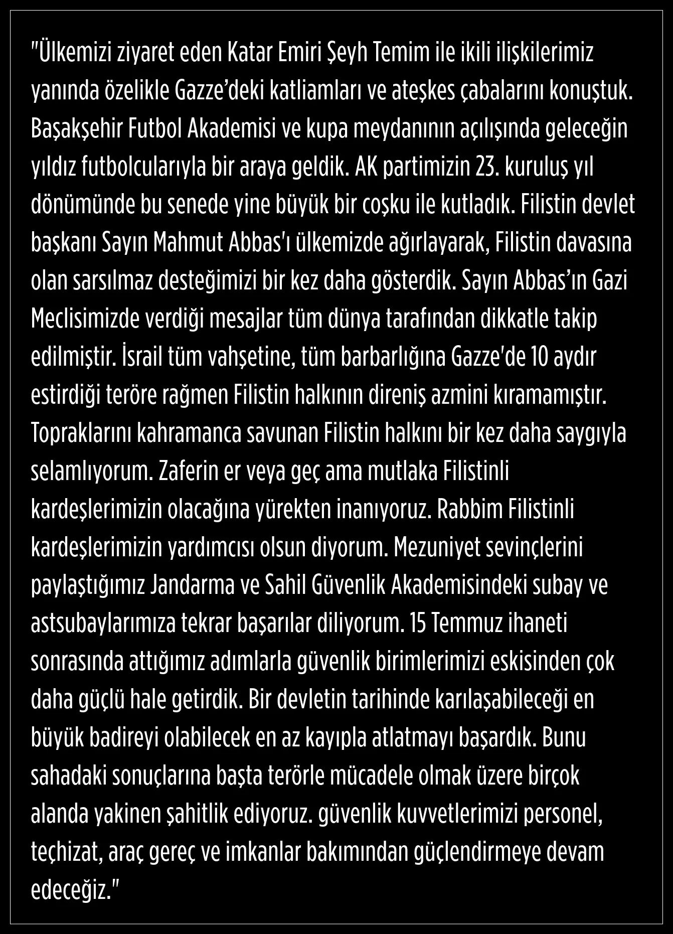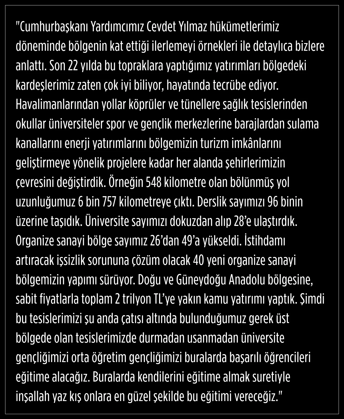 Bugünkü tarihi kabine toplantısının en önemli gündemlerinin Bitlis başta olmak üzere Doğu ve Güneydoğu Anadolu bölgesinde ki projeler olduğunu belirten Erdoğan konuşmasını şöyle noktaladı: