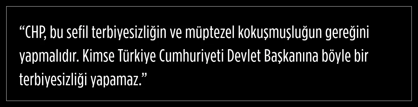AK Parti Genel Başkanvekili Efkan Ala, sosyal medya platformu X’teki @efkanala hesabı üzerinden yaptığı açıklamada, CHP’nin, bu müptezel kokuşmuşluğun ve bu sefil terbiyesizliğin gereğini yapması gerektiğini belirterek, kimsenin Türkiye Cumhuriyeti Devlet Başkanı'na yönelik böyle bir terbiyesizliği yapamayacağını vurguladı.