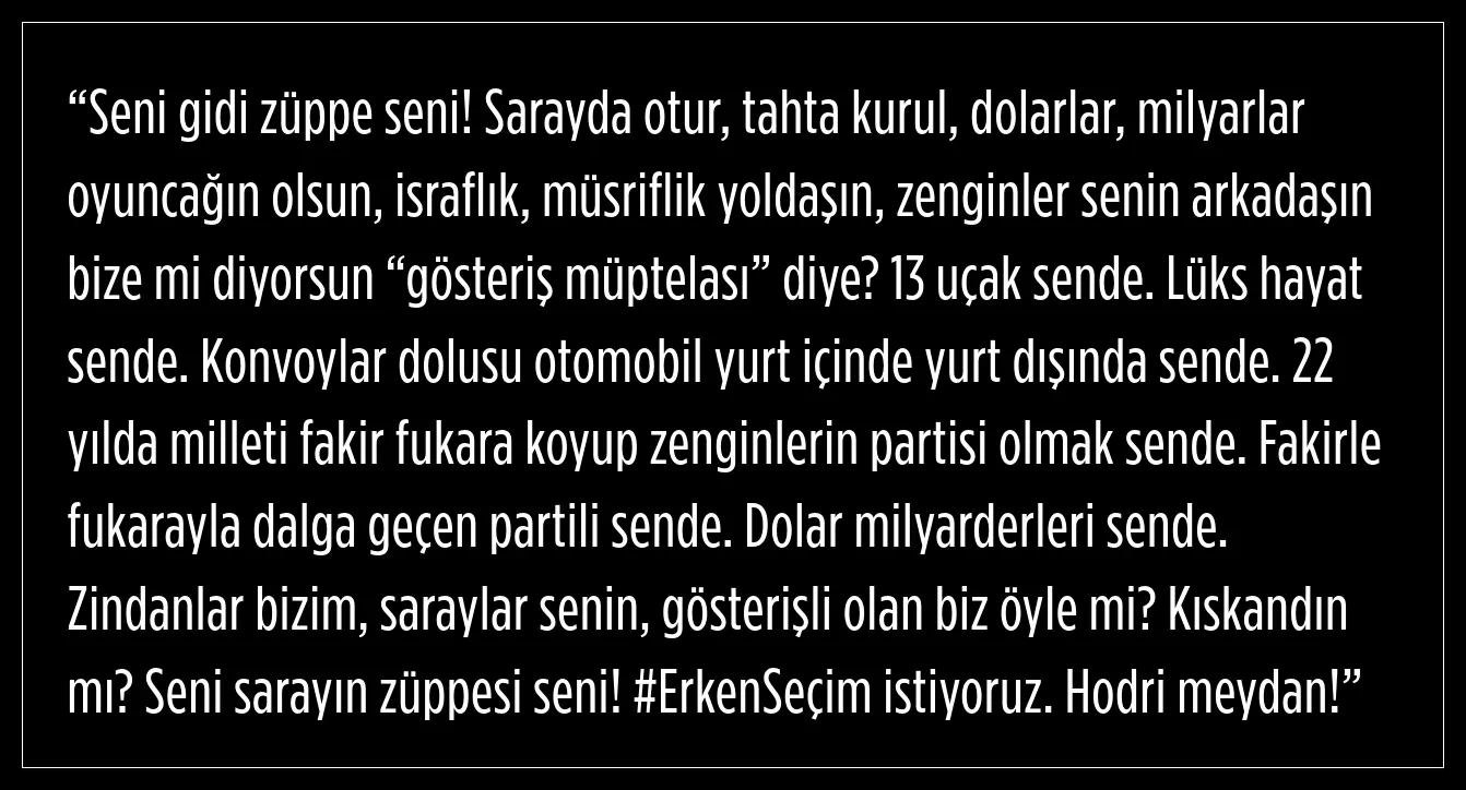 CHP İzmir Milletvekili Tuncay Özkan, Türkiye Cumhurbaşkanı Recep Tayyip Erdoğan’a atfen yaptığı paylaşımına, “Seni gidi züppe seni!” şeklinde son derece seviyesiz bir giriş yapmış, Erdoğan’ın sarayda oturduğunu, tahta kurulduğunu, dolarların ve milyarların oyuncağı olduğunu, israf ve müsrifliğin yoldaşı olduğunu, zenginlerin hep Erdoğan’ın arkadaşı olduğunu, kalkıp “gösteriş müptelası” diye CHP’ye laf attığını, 13 uçağın Erdoğan’da olduğunu, lüks hayata sahip olduğunu, konvoylar dolusu otomobilih yurt içinde ve yurt dışında Erdoğan’da olduğunu, AK Parti’nin 22 yılda milleti fakirleştirip zenginlerin partisi olduğunu, fukarayla dalga geçen partililerin AK Parti’de olduğunu, dolar milyarderlerinin Erdoğan’ın yanında bulunduğunu, zindanların CHP’lilerin, sarayların Erdoğan’ın olduğunu ileri sürerek, “Gösterişli olan biz öyle mi?” diye sormuş ve bir kez daha “Seni sarayın züppesi seni!” ifadelerini kullanarak #ErkenSeçim istiyoruz etiketi ve “Hodri Meydan” ifadesiyle hakaretlerini sonlandırmıştı.