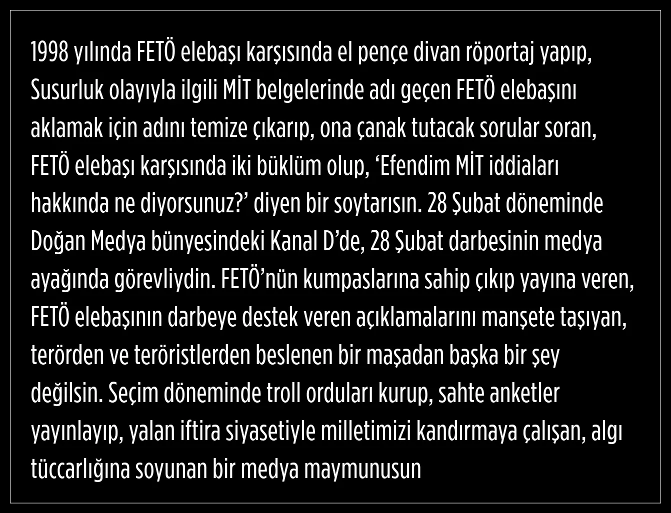 "Algı tüccarlığına soyunan bir medya maymunusun"