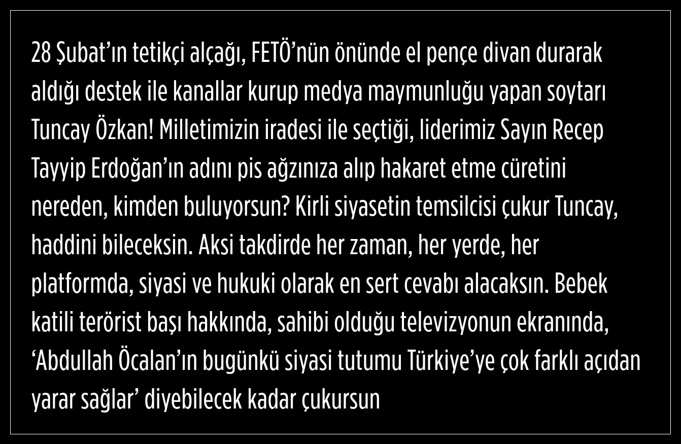 Ankara İl Başkanı Hakan Han Özcan, Cumhurbaşkanı Erdoğan'a hakaret eden CHP'li Tuncay Özkan'a sert tepki gösterdi.