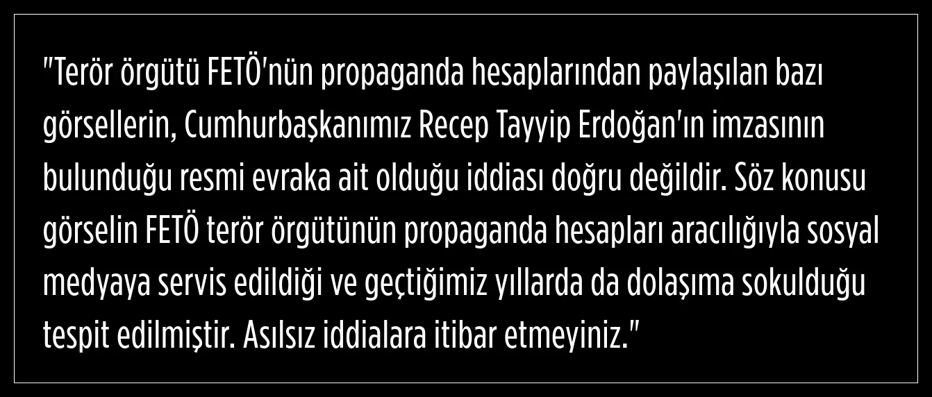 CİB (Cumhurbaşkanlığı İletişim Başkanlığı) DMM (Dezenformasyonla Mücadele Merkezi), Fetullahçı Terör Örgütü / Paralel Devlet Yapılanması (FETÖ/PDY)'nın propaganda hesaplarından paylaşılan ve "Türkiye Cumhurbaşkanı Recep Tayyip Erdoğan'ın imzasının bulunduğu resmi evrak" iddiasıyla sunulan görselin gerçeği yansıtmadığını açıkladı.