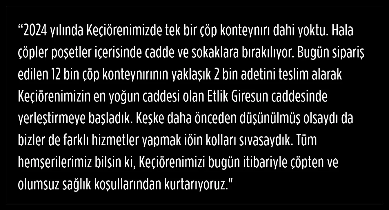 Keçiören'deki tüm sokaklara konteyner yerleştireceklerini söyleyen Özarslan, şunları kaydetti: