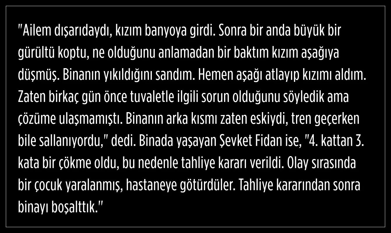 Fatih'te yaklaşık 50 yıllık bir binada meydana gelen olayda, 15 yaşındaki Eda Maden, 4. katta banyo yaptığı sırada banyonun tabanı çöktü ve alt kata düştü. Hafif yaralanan Maden hastaneye kaldırılırken, binada yaşayanlar tahliye edildi.