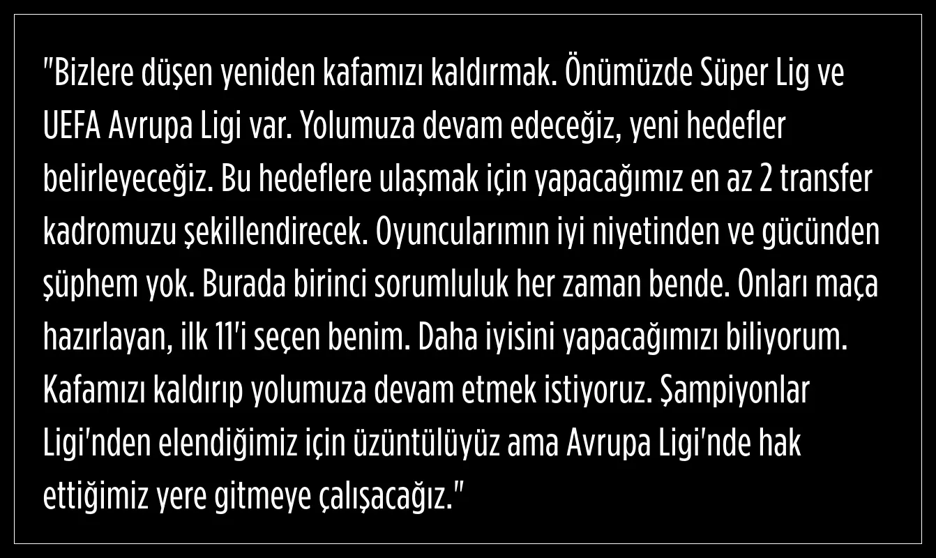 Okan Buruk, Şampiyonlar Ligi'ne katılma amacını gerçekleştiremediklerinden dolayı duyduğu üzüntüyü dile getirirken, "Şampiyonlar Ligi'nde mücadele eden bir takımın teknik direktörü olarak burada olmak isterdim. Ülkemizi en iyi şekilde temsil etmeyi hedefliyorduk, ancak bu hedefimizi gerçekleştiremedik. Bu durum, hem camiamız hem de taraftarlarımız için büyük bir hayal kırıklığı." şeklinde konuştu.