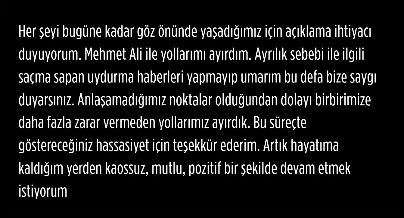 Ancak bir süre sonra çiftten kötü haber geldi. Evlenmeleri beklenen Mehmet Ali Erbil ve Gülseren Ceylan ayrıldı.