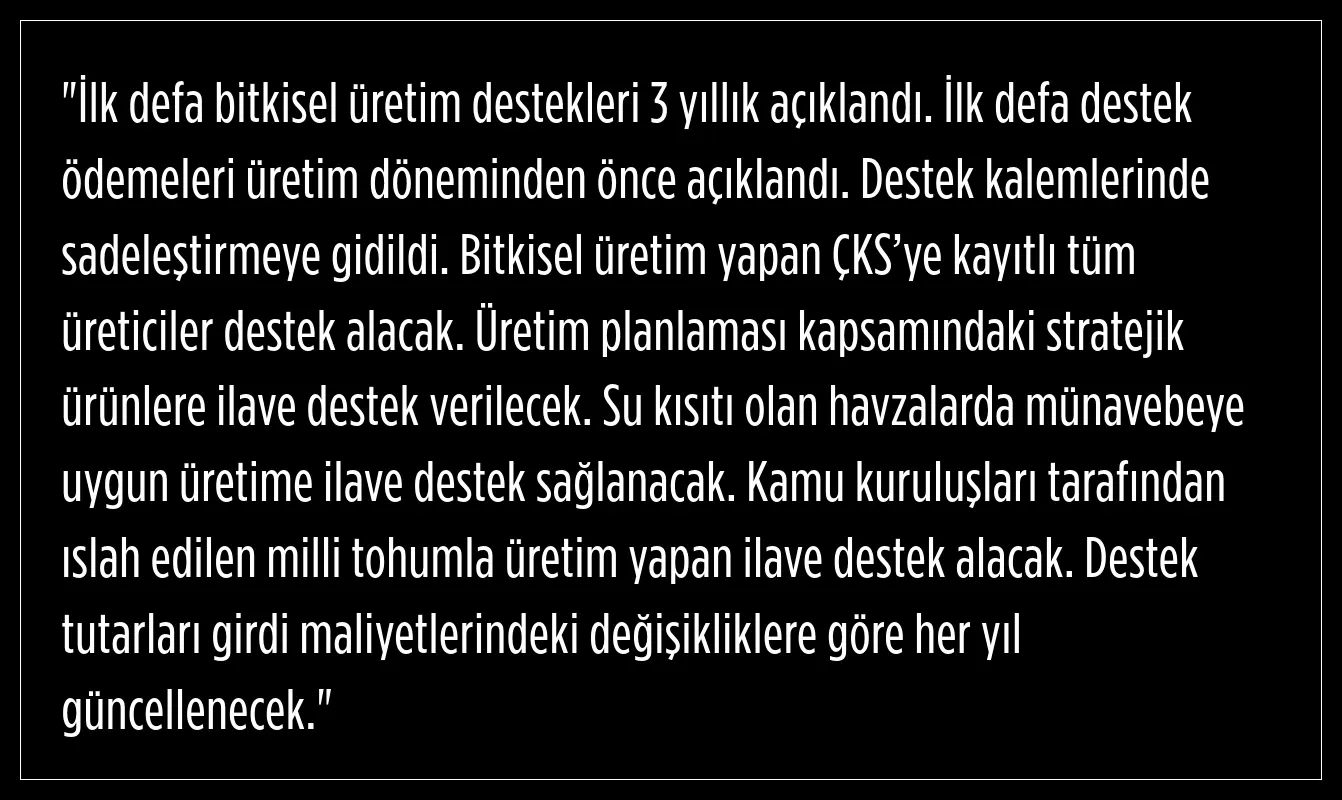Bitkisel üretim desteklerinin ilk kez 3 yıllık olarak açıklandığını aktaran Tarım ve Orman Bakanı İbrahim Yumaklı, yeni model hakkında şu bilgileri verdi: