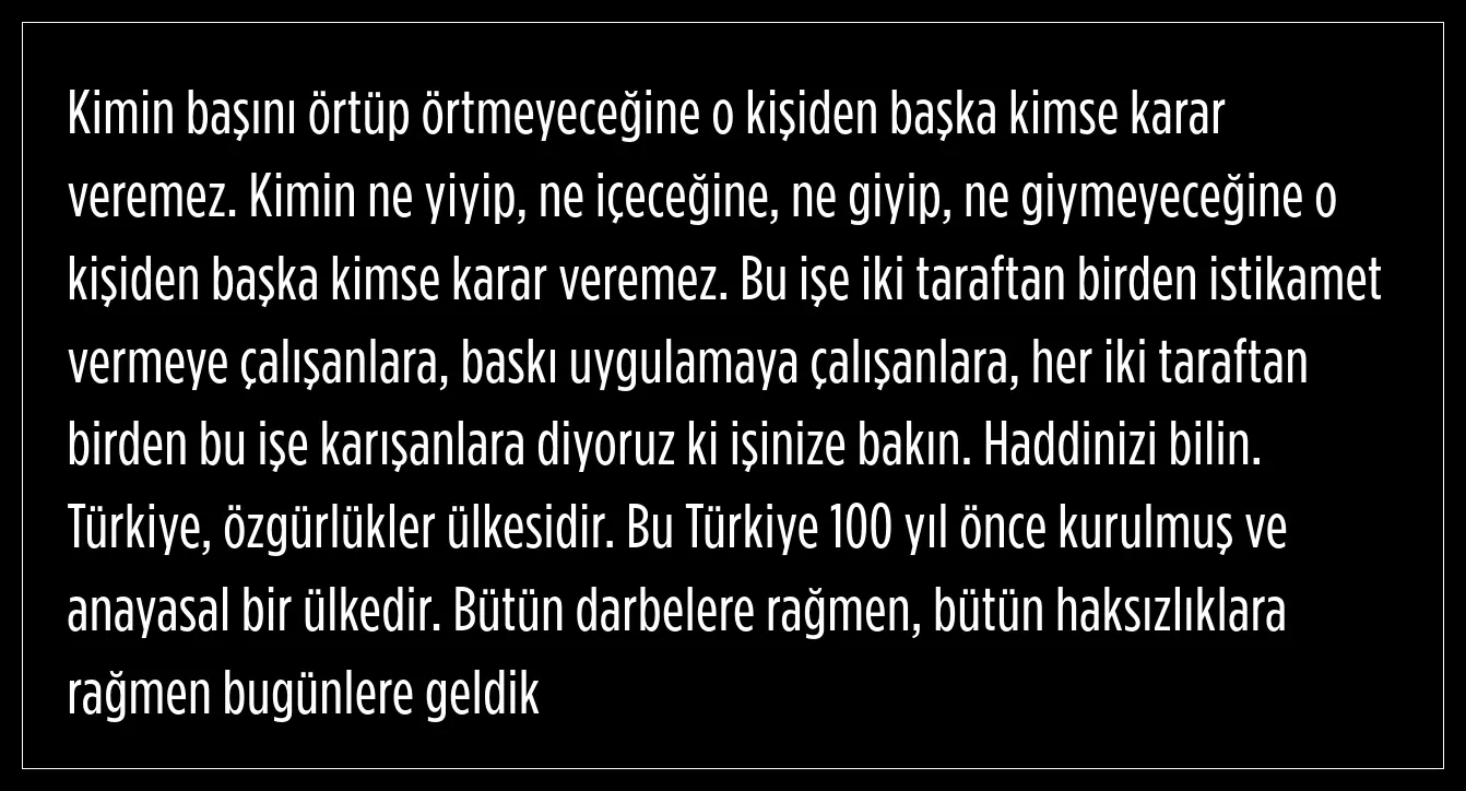 Özgür Özel, Türkiye'de herkesin inancının, örtünmesinin ya da örtünmemesinin, yaşam şeklinin, tercihlerinin tam bir özgürlük içinde olması gerektiğini ifade etti. Özel, CHP olarak bunun teminatı olduklarını, herkesin meseleye böyle yaklaşması gerektiğini belirtti.