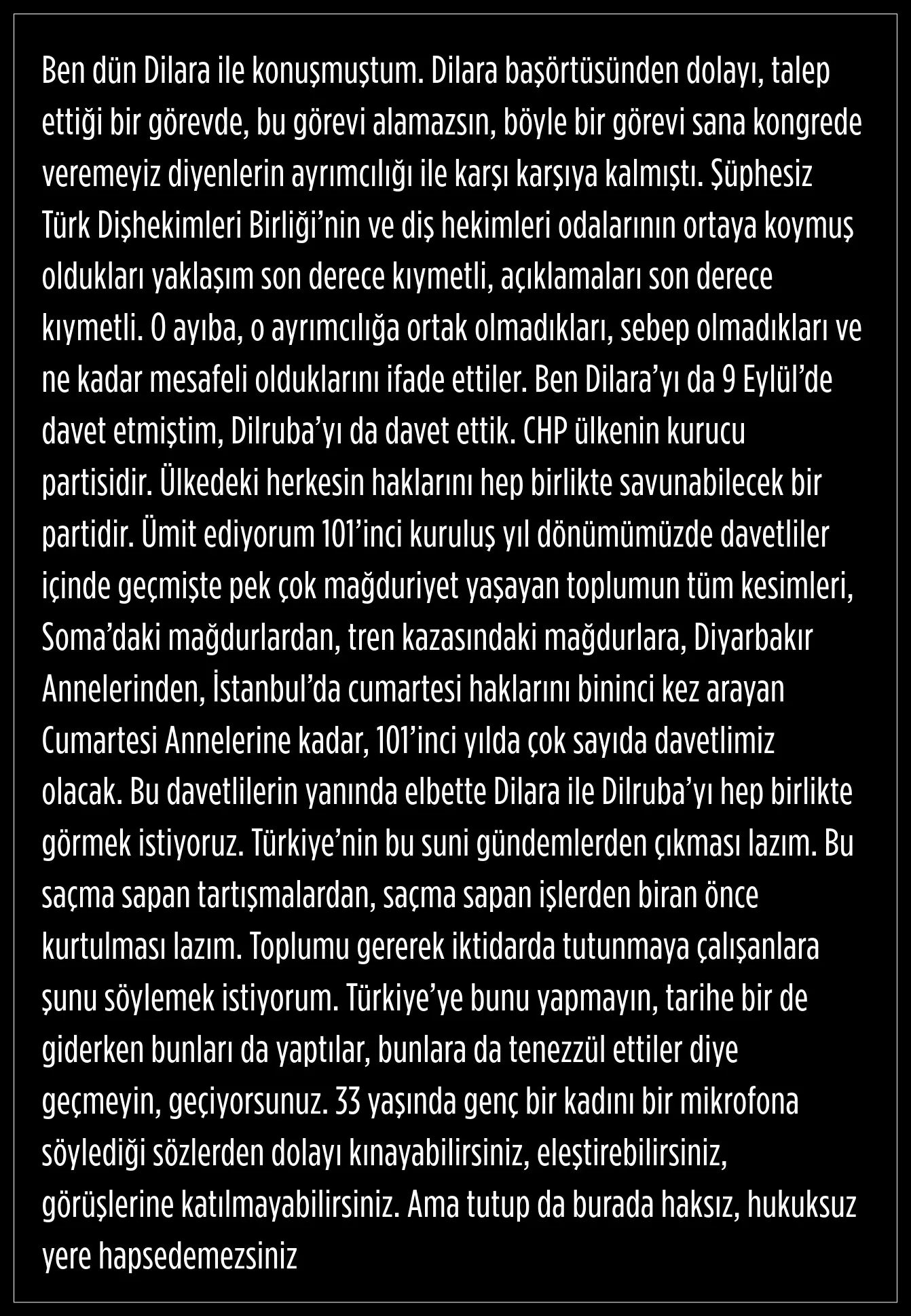 Dilruba'nın tutukluluğunun baştan sona hukuksuzluk olduğunu ifade eden Özel, herkesin düşüncesi ne kadar şok edici olacak olursa olsun şiddete başvurmamak, çağırmamak kaydıyla her türlü düşünceyi açıklama hakkı olduğunu bunun bir anayasal bir hak olduğunu söyledi.