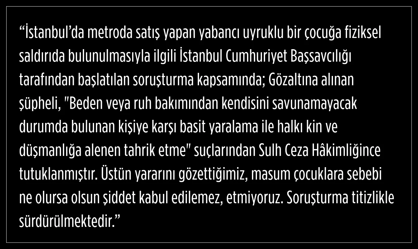 Metroda satış yapan çocuğa fiziksel saldırı yapılmasıyla ilgili, İstanbul Cumhuriyet Başsavcılığı tarafından başlatılan soruşturmanın titizlikle sürdürüldüğünün altını çizen Bakan Tunç, gözaltına alınan şüphelinin tutuklandığını açıkladı.