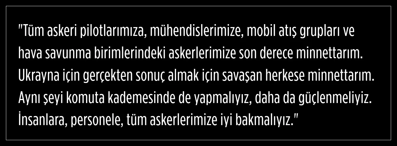 Volodomir Zelensky, askerlere olan minnettarlığını dile getirdi. Aynı şeyi komuta kademesi içinde yapmaları gerektiğini belirten Zelensky, daha da güçlenmeleri gerektiğini ifade etti.