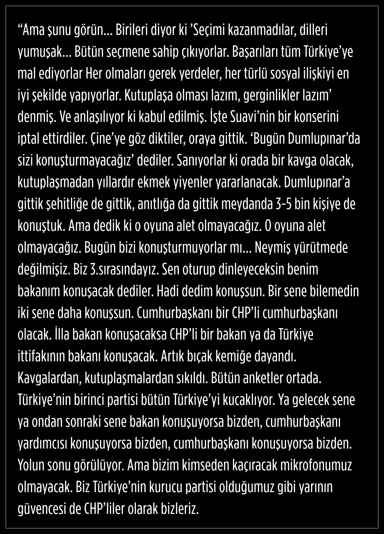 CHP Lideri Özel, mevcut iktidara gönderme yaparak, bir veya iki yıl içinde CHP'nin iktidara geleceğini ve bir CHP'li cumhurbaşkanının göreve başlayacağını belirtti. Türkiye'nin birinci partisi olarak CHP'nin, ülkeyi kucaklayacağını ve kutuplaşmadan uzak, birleştirici bir siyaset anlayışıyla hareket edeceğini vurguladı.