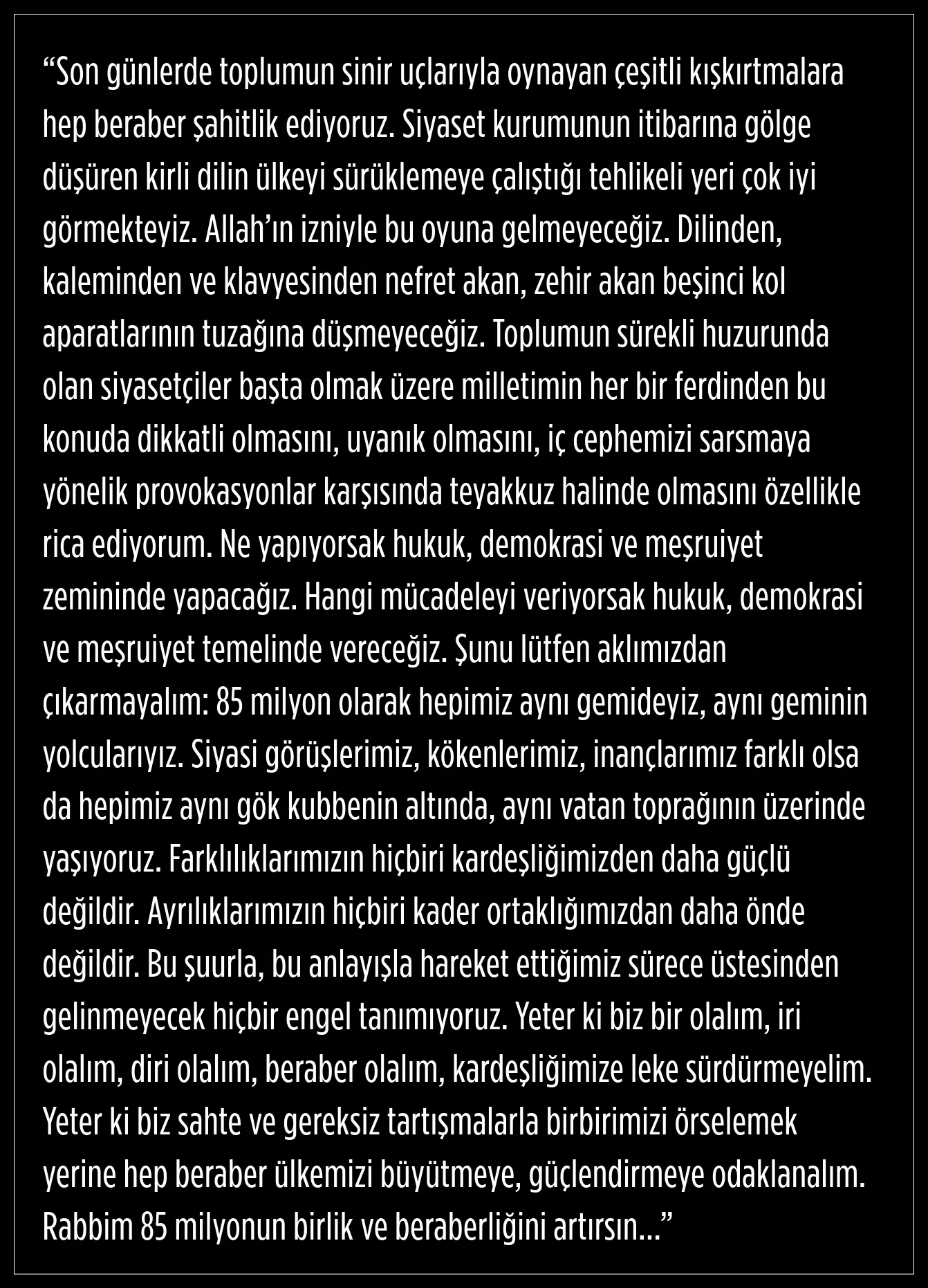 Siyasetçiler başta olmak üzere herkesten dikkatli ve uyanık olmasını isteyen Erdoğan, iç cepheyi sarsmaya yönelik provokasyonlar karşısında teyakkuzda olunması ricasında bulundu.