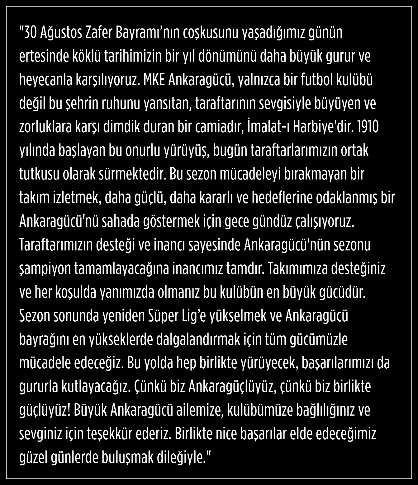 30 Ağustos zaferinin hemen ertesine rastlayan bu özel yıldönümünün gurur ve heyecanla karşılandığına işaret edilen açıklamada, MKE Ankaragücü’nün, yalnızca bir futbol kulübü değil, şehrin ruhunu yansıtan, taraftarının sevgisiyle büyüyen ve zorluklara karşı dimdik duran bir camia olduğu vurgulandı.