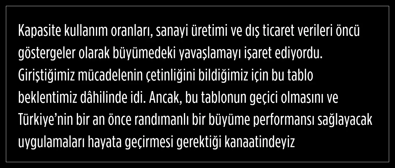 Baran, büyümedeki bu yavaşlamanın enflasyonla mücadele sürecinin bir sonucu olduğunu ifade etti. Özellikle kapasite kullanım oranları, sanayi üretimi ve dış ticaret verilerinin, büyümedeki bu yavaşlamanın öncü göstergeleri olarak öne çıktığını belirtti.